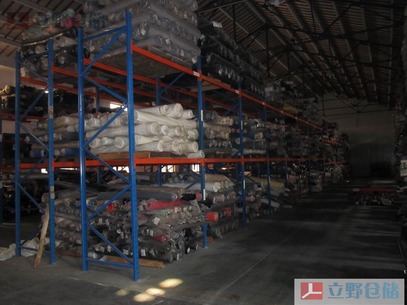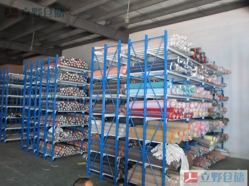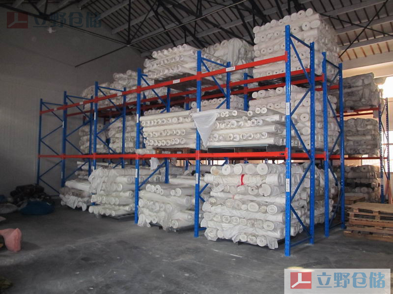 重型面料貨架采用的是橫梁式重型貨架結構,將面料置于托盤上或面料框內,然后用叉車將托盤(面料框)挑起,再放入貨架上的一種存取方式。根據承載量的不同,貨架上可配備井字跨梁等輔件產品,以達到安全高效的作用。